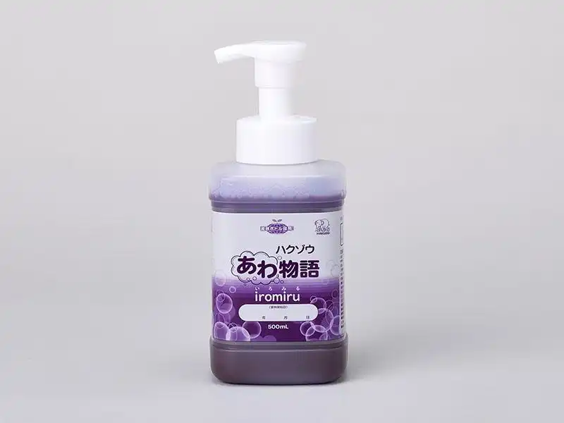 色が変わる500mLの泡ハンドソープです。手洗いすると約30秒で白く変化します。