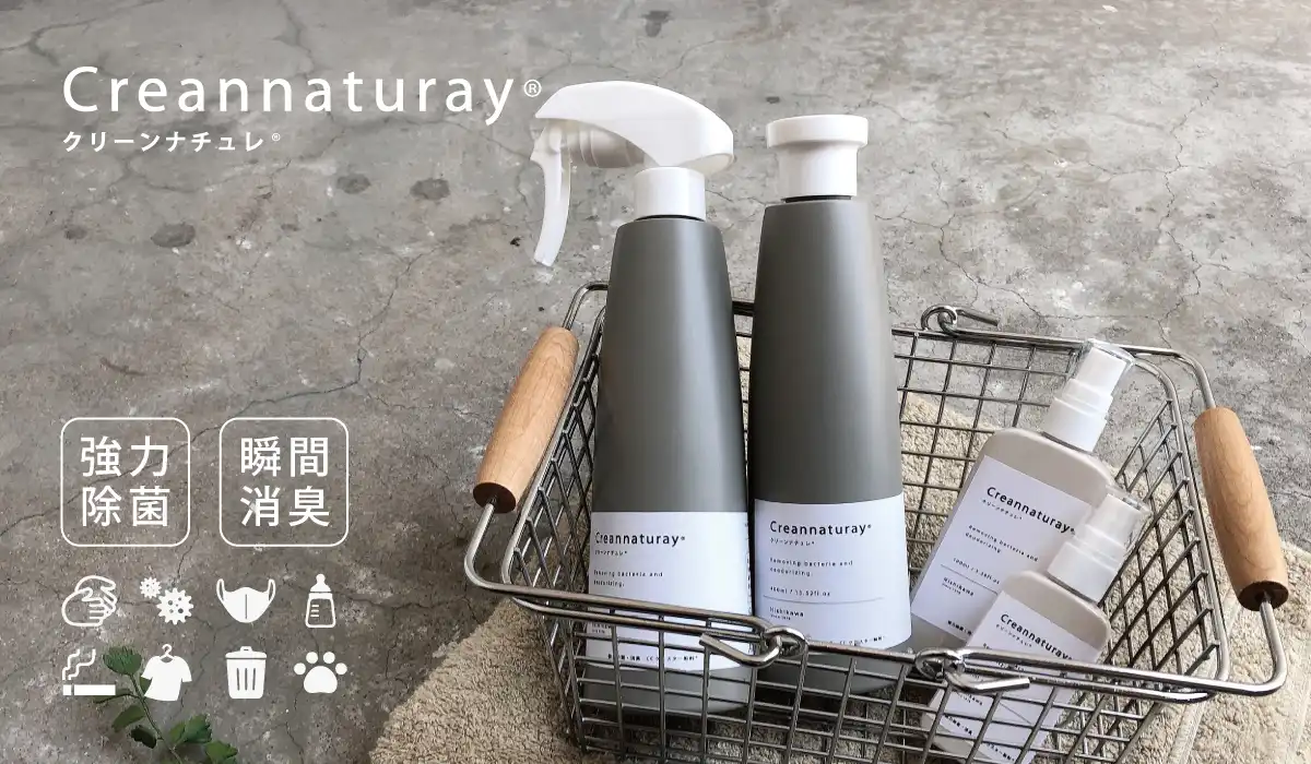 100%食品添加物組成の成分(安定型次亜塩素酸ナトリウム)でつくられた、強力除菌・消臭剤です。アルコールフリーで手肌にやさしく、無香料・無着色。人にも環境にもやさしい成分でつくられています。